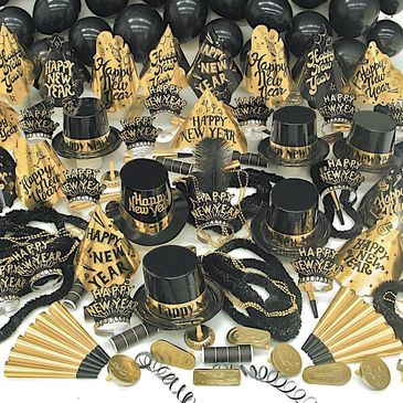 This New Years Party Favor Package includes a top hat and tiara for the bartenders, foil hats, glittered tiaras, noise makers, horns, metallic beads, Hawaiian leis, serpentine throws and balloons. Different packages available. Inquire for details on pricing to add this package. Different sizes available and amounts per package.